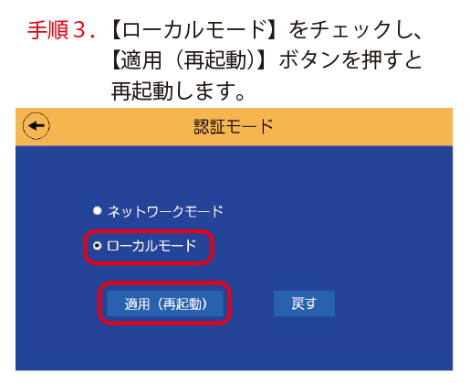 【適用(再起動)】を押してネットーワークモードに戻してください。