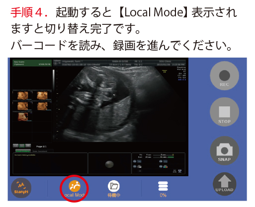 1.ローカルモードの場合、録画されたデータは端末の中に保存されます。妊婦様がすぐ確認できない状態です。